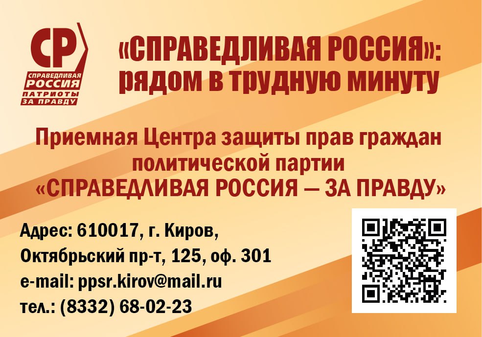В Кировском региональном отделении Партии СПРАВЕДЛИВАЯ РОССИЯ – ЗА ПРАВДУ работает компетентный юрист, к которому любой житель нашего региона может обратиться за помощью в решении проблем в сферах: