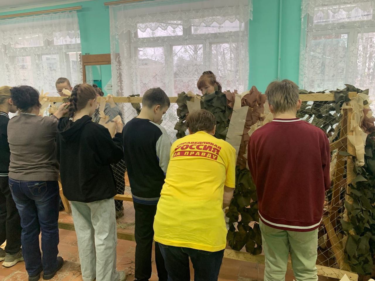 Добровольцы партии показали школьникам, как вручную изготавливать сети, которые так необходимы нашим защитникам.