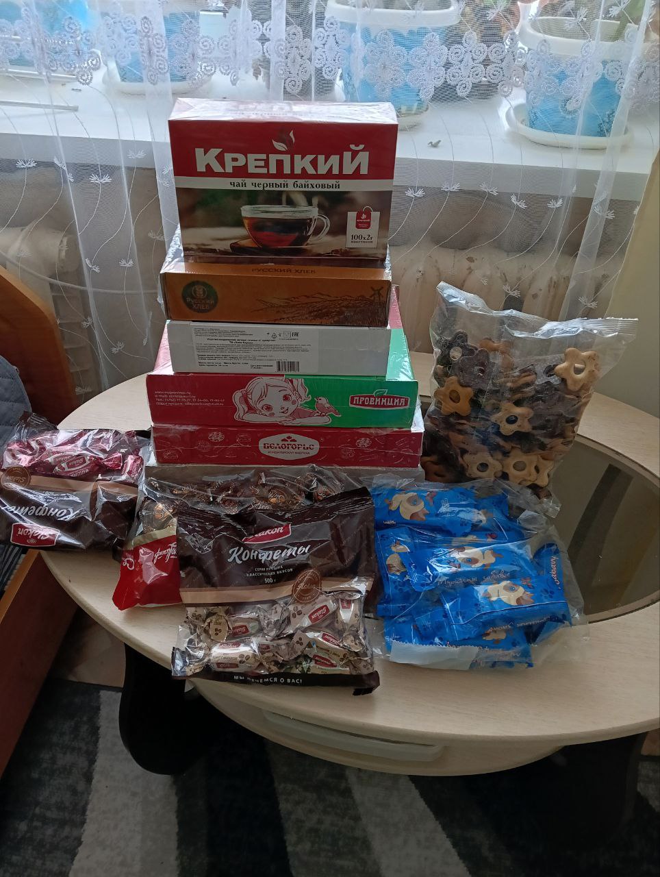 А также все 20 проживающих пенсионеров получили подарки – печенье, конфеты и чай для праздничного стола.