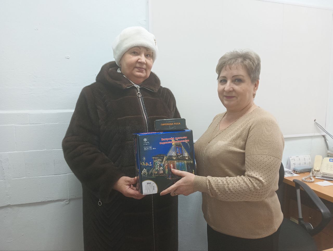 Она поздравила с наступающими праздниками всех пенсионеров. От имени партии она вручила новогодние гирлянды для украшения елки и здания.